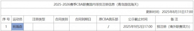 8月31日,CBA官方更新了本土球员注册名单,青岛男篮已完成对杨瀚森的预注册手续。