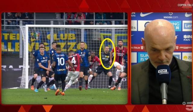 让皮奥利最终发飙的导火索,自然是主裁马里亚尼在下半场的那次争议判罚:米兰角球开出,皮球飞出禁区,本纳塞尔抢先劳塔罗一步来到球前,用左脚轰出世界波洞穿了蓝黑球门。马里亚尼并未马上判罚进球有效,反而选择回看VAR,镜头显示,为本纳塞尔做球的托莫里并未手球,但马里亚尼随后认定,阿尔及利亚人射门的一刹那,处于越位位置的卡卢卢干扰了汉达诺维奇的视线,最终判罚进球无效。